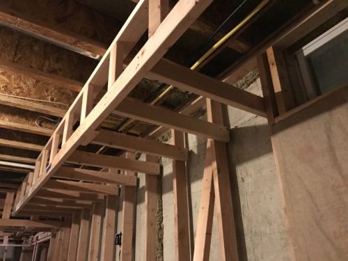 In addition to the fiberglass batts, because we left gaps behind the studs and because we have a lot of concealed spaces in our soffits, we are required to install fireblocking to prevent the spread of fire. These blocks are necessary every 10’ on center and can be constructed with plywood or as in our case, fireblocking insulation. We used a product called Roxul Safe-N-Sound. It is a stone wool insulation that is fire resistant and also provide excellent acoustical dampening. My husband installed all of this insulation – he used a bread knife to cut it and friction fit it in between the ceiling joists to provide some additional acoustical separation from the upstairs space. Small pieces were stuffed where a fire block was required, at the gap between the top plates of our new walls and the concrete wall as well as behind vertical studs. Always follow your code requirements where you live – an architect can help with this too! We also plan to insulate around the bathroom as well to minimize the sound transfer from this area to the other parts of the basement.